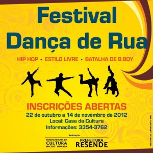 Devido à grande procura e o feriado prolongado, a Casa da Cultura Macedo Miranda estará funcionando nesta segunda-feira, das 9h às 12h, para realizar as últimas inscrições para o II Festival de Dança de Rua de Resende, que terminariam no último dia 14 (quarta-feira). As apresentações acontecem nos dias 22 e 23, a partir das 18h, no Cine Vitória.