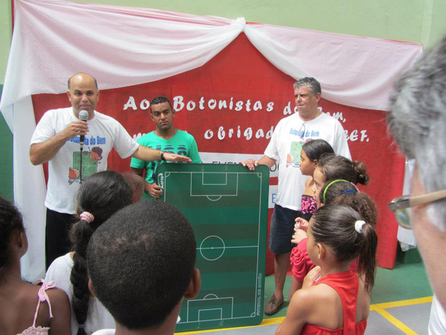 Em abril do ano passado, o jornal BEIRA-RIO entrevistou um dos industriários que forma um grupo que atua sem fins lucrativos tendo como objetivo difundir socialmente o futebol de mesa (ou o popular futebol de botão) entre as comunidades de Resende. Em 2012, Marcos Mattos, Reginaldo Lima (os dois na foto, com Gil Guedes no centro), Adalberto Croque e Elias Neto deram início a um projeto realizado a cada três meses em algum bairro do município.