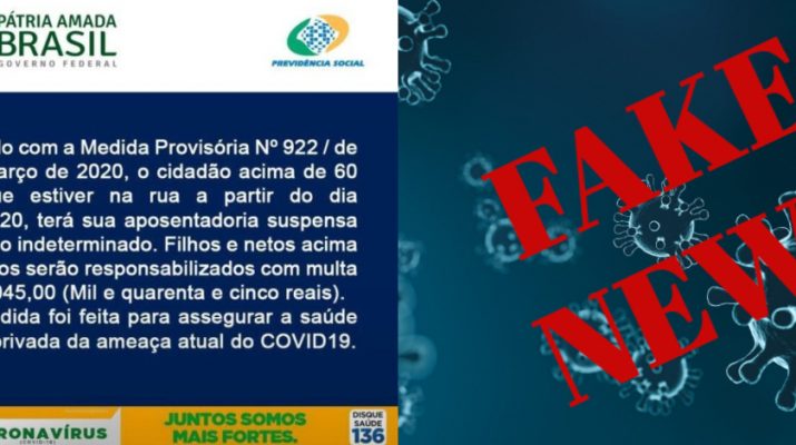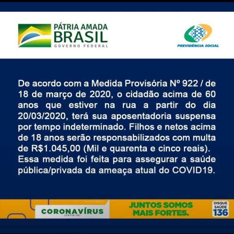 Nesta semana, outro fake news atormentou a vida de aposentados no Brasil. É que circulou uma informação nas redes sociais atribuída ao Governo Federal, informando através de um comunicado que a Medida Provisória 922, de 18 de março deste ano, proíbe pessoas com mais de 60 anos de saírem às ruas, sob pena de suspensão de aposentadorias e multas para os filhos e netos, em virtude da ameaça de contágio do Covid-19.