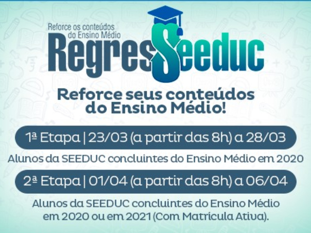 Começa nesta quinta-feira, dia 1º, e vai até o dia 6 as inscrições para o poderão se inscrever no reforço escolar online da rede estadual de ensino RegresSeeduc, voltado aos alunos que estão na 3ª série do Ensino Médio que tiverem interesse em participar do Enem deste ano. A matrícula é especial e segue aberta aos estudantes que terminaram o ciclo básico em 2020. As aulas começam no dia 12 de abril, via Google Classroom e pelo aplicativo de navegação gratuita Applique-se, oferecido pela Secretaria de Estado de Educação.