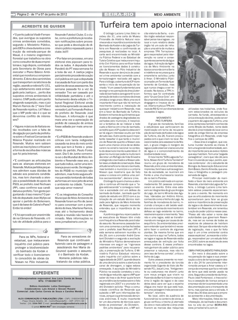 Foi quando a editora Ana Lúcia citou em sua coluna de dezembro de 2012 que no ano seguinte os assuntos ligados ao Meio Ambiente estariam em alta na cidade devido a má reputação do ex-presidente da Agência Municipal do Meio Ambiente de Resende (Amar), Paulo Fontanezzi. Nos últimos 20 anos, quatro assuntos ambientais chamaram negativamente a atenção da população, sendo que três aconteceram na gestão do ex-presidente da Amar.