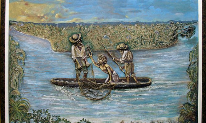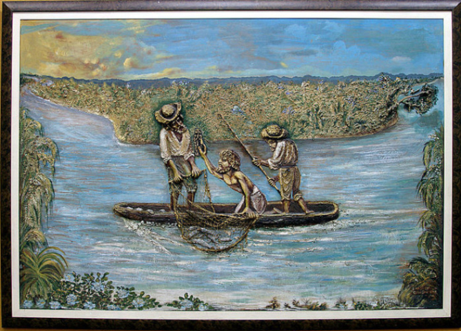 Após várias tentativas infrutíferas, desceram o curso do rio até chegarem ao Porto Itaguaçu. Eles já estavam a desistir da pescaria quando João Alves jogou sua rede novamente, em vez de peixes, apanhou o corpo de uma imagem da Virgem Maria, sem a cabeça. Ao lançar a rede novamente, apanhou a cabeça da imagem, que foi envolvida em um lenço.