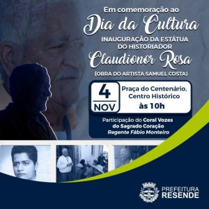 Nesta sexta-feira, dia 4 de novembro, Dia da Cultura, a municipalidade presta uma justíssima homenagem ao saudoso historiador e agitador cultural, Claudionor Rosa. Às 10 horas será inaugurada na Praça do Centenário, no Centro Histórico de Resende, uma estátua do mestre, que nos deixou há cerca de três anos. A obra é uma criação do artista Samuel Costa, que eterniza em um dos logradouros que mais acumula retalhos da história local, a figura querida do velho Rosa. Claudionor fará companhia ao poeta Luiz Pistarini que tem um busto no local. O ato será animado pelo Coral Vozes do Sagrado Coração, regido por Fábio Monteiro.