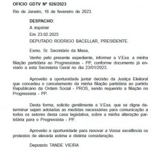 Segundo publicação em Diário Oficial o deputado estadual Tande Vieira comunicou por ofício ao presidente da Assembleia Legislativa (Alerj), Rodrigo Bacellar, a mudança de partido político. Tande saiu do Partido Republicano da Ordem Social (Pros), partido pelo qual se elegeu e ingressou no Partido Progressista (PP).
